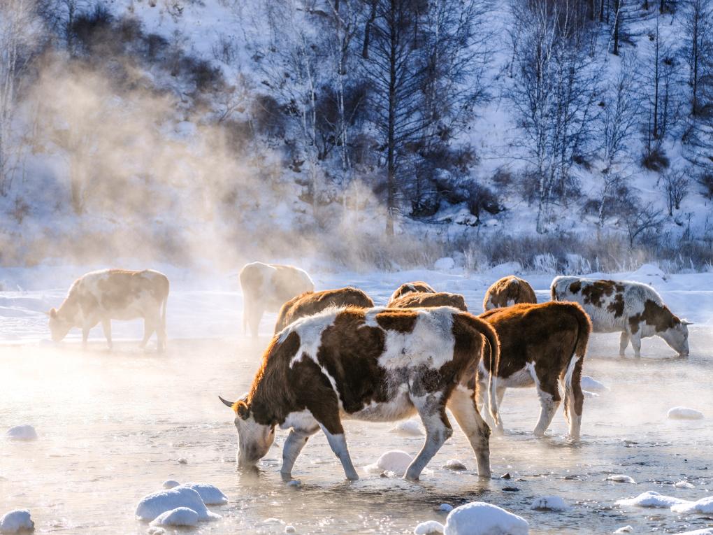 严寒中,不冻河岸边雾凇、氤氲白雾与饮水牛群,仿佛是童话世界里的绝美场景,吸引着游客争相打卡。旅拍摄影师李云生忙得“脚不沾地”,引导游客拍摄 “泼水成冰”、与牛群合影。