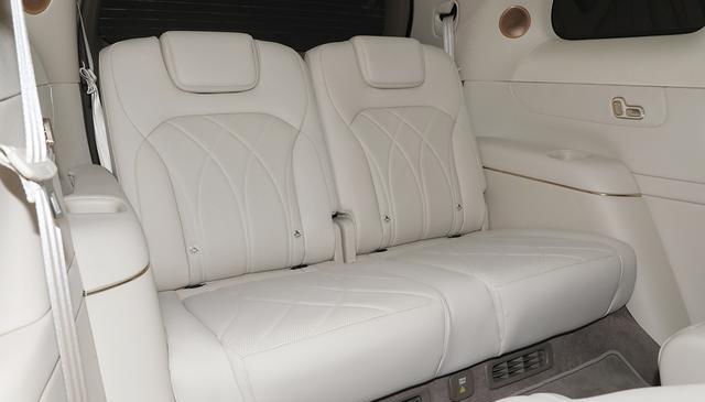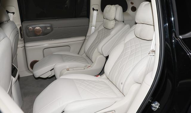 座椅采用的是2+2+2布局,第二排的两个座椅带有电动腿托,其坐垫和靠背也提供了前后电动调节功能,前两排座椅都提供了座椅加热、通风功能,另外后排还提供了车顶吸顶屏、小桌板以及车载冰箱等,有着不错的舒适性。