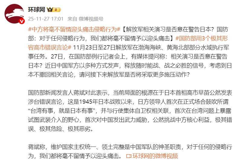 国防部新闻发言人蒋斌对此表示,当前局面的根源在于日本首相高市早苗公然发表涉台错误言论,这是1945年日本战败以来,日方领导人首次在正式场合鼓吹所谓“台湾有事,就是日本有事”,并与行使集体自卫权相关联,首次在台湾问题上暴露试图武装介入的野心,首次对中国发出武力威胁,公然挑战中方核心利益,极其错误、极其危险、极其恶劣。